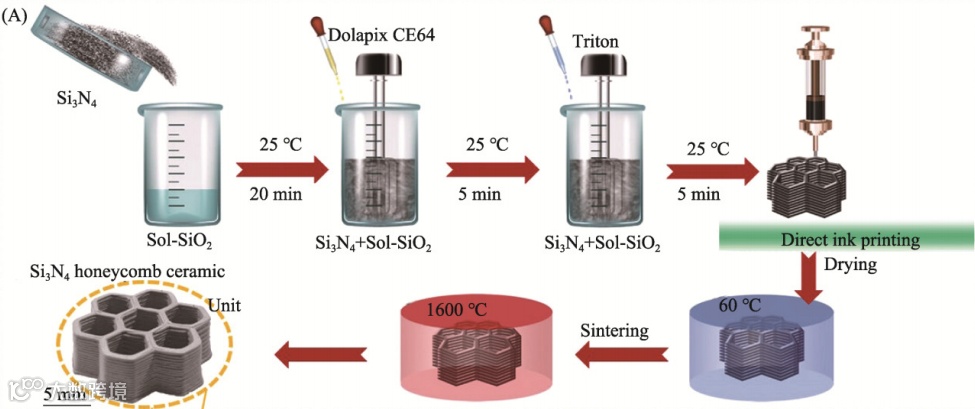 ▲DIW制备蜂窝状Si3N4多孔陶瓷过程示意图