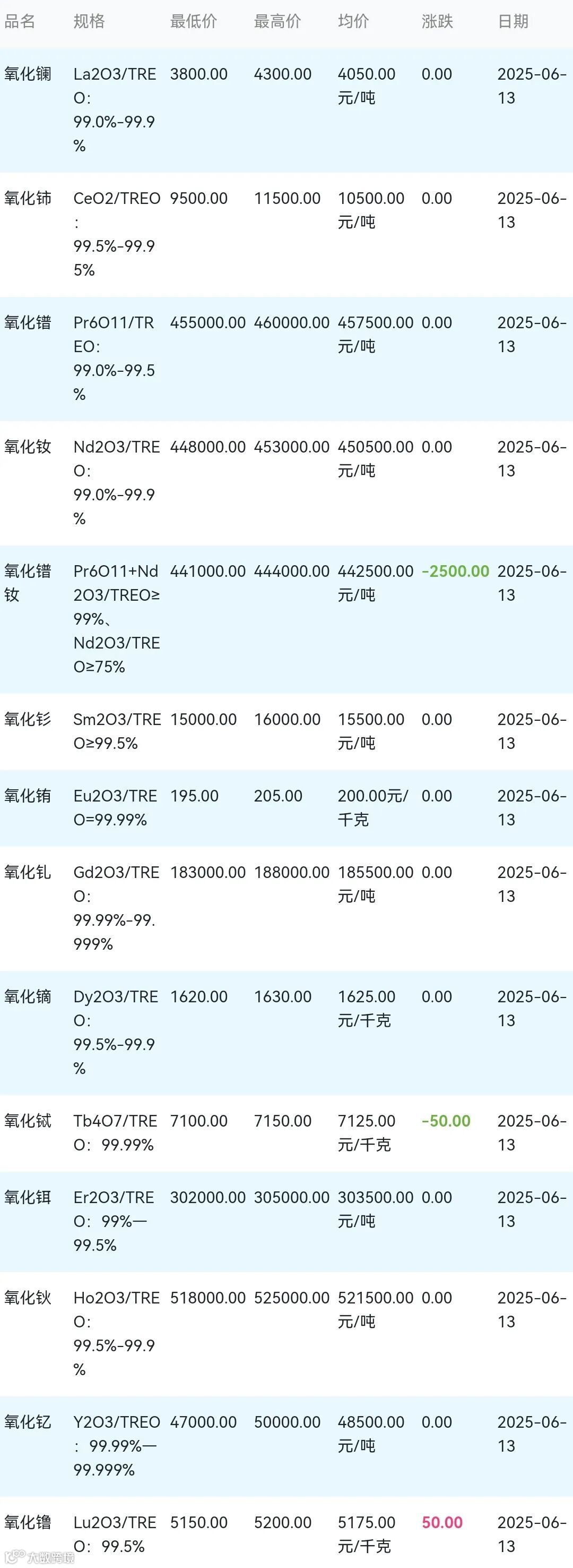 2025年06月13日稀土氧化物材料市场参考价: