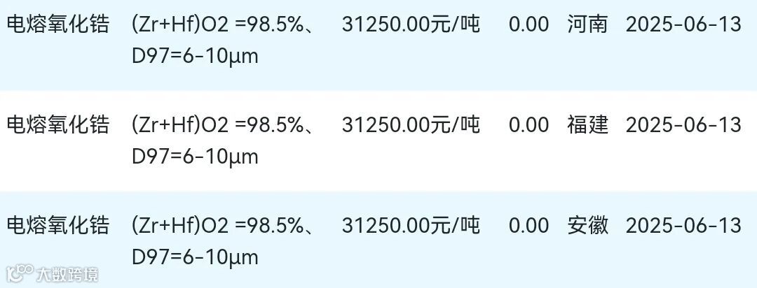 2025年06月13日氧化锆材料市场参考价: