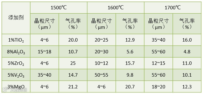 制备时对MgO原料进行处理后,按组成进行配料。为了促进烧结以及能使晶粒稍微长大些,同时为了减少制备的水化倾向,可加入一些添加剂,如TiO2、Al2O3、V2O3等。表1列出了一些添加剂对MgO晶粒尺寸和烧结性的影响。如果要求具有高纯度的MgO陶瓷,就不能采用加入添加剂的方法来促进烧结和晶粒长大,而是采用活化烧结的方法,即将Mg(OH)2在适当温度下煅烧,得到具有很多晶格缺陷的活性MgO,用以制造烧结氧化镁陶瓷。一般在1200℃煅烧分解Mg(OH)2为宜。