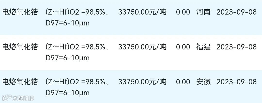 2023年09月08日氧化锆材料市场参考价: