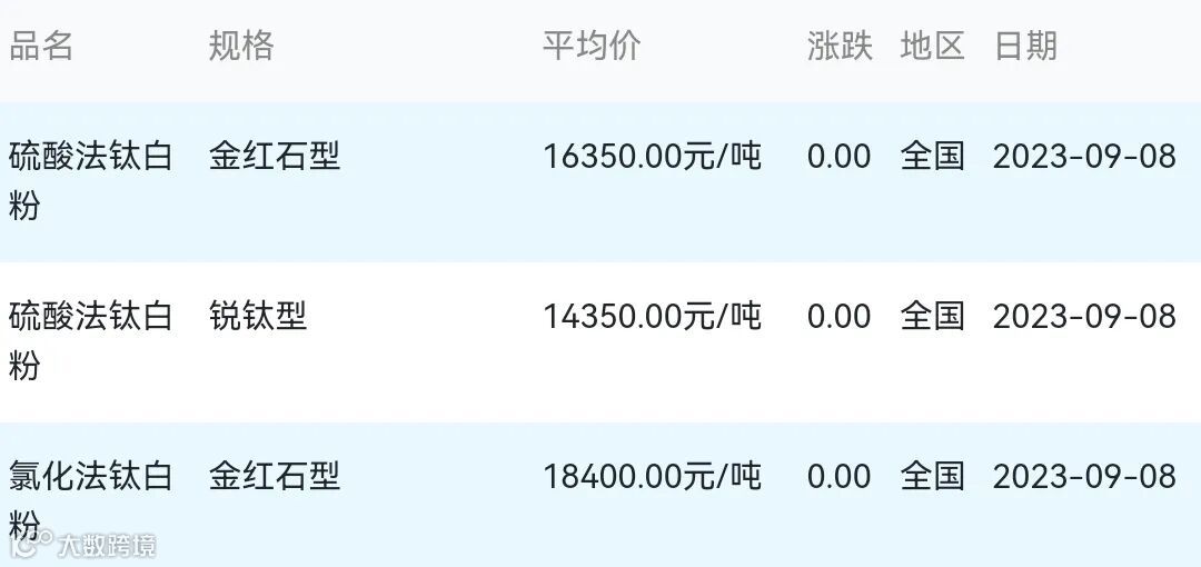 2023年09月08日钛白粉材料市场参考价: