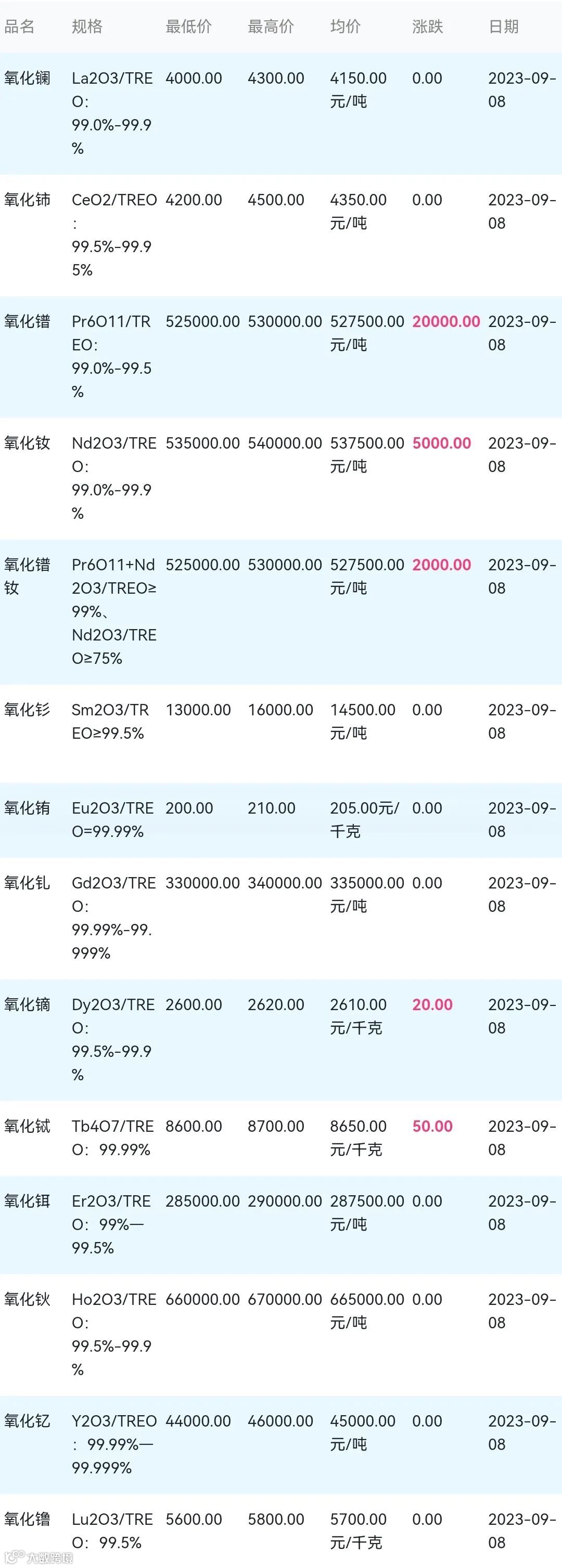 2023年09月08日稀土氧化物材料市场参考价: