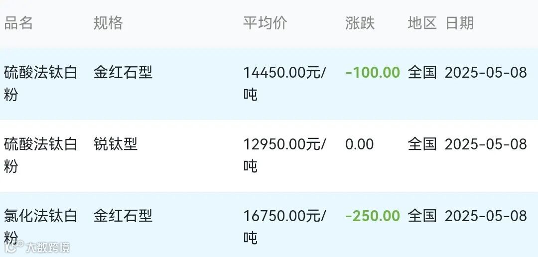 2025年05月08日钛白粉材料市场参考价: