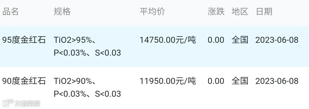 2023年06月08日金红石材料市场参考价: