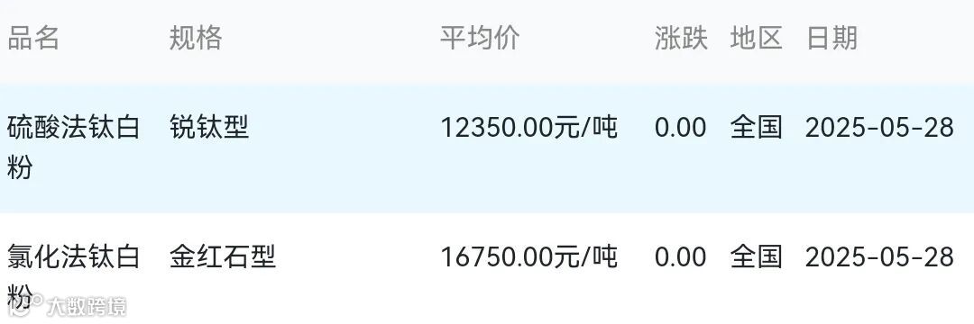 2025年05月28日钛白粉材料市场参考价: