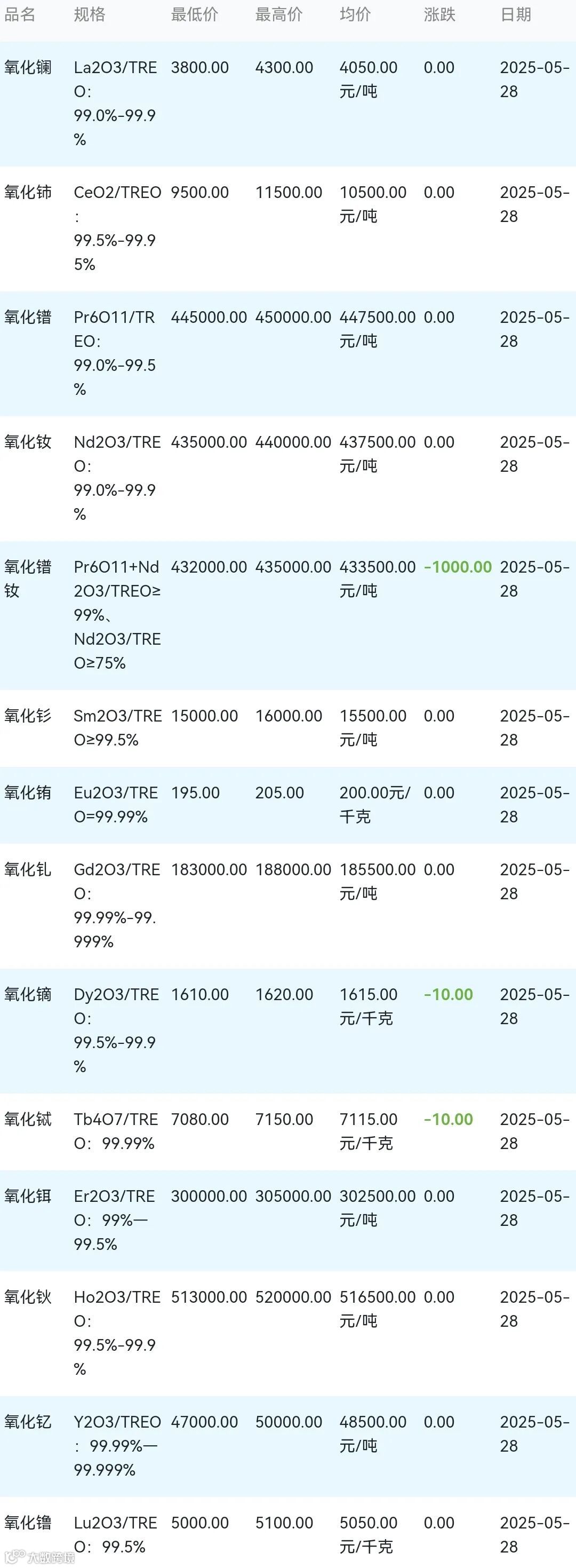 2025年05月28日稀土氧化物材料市场参考价: