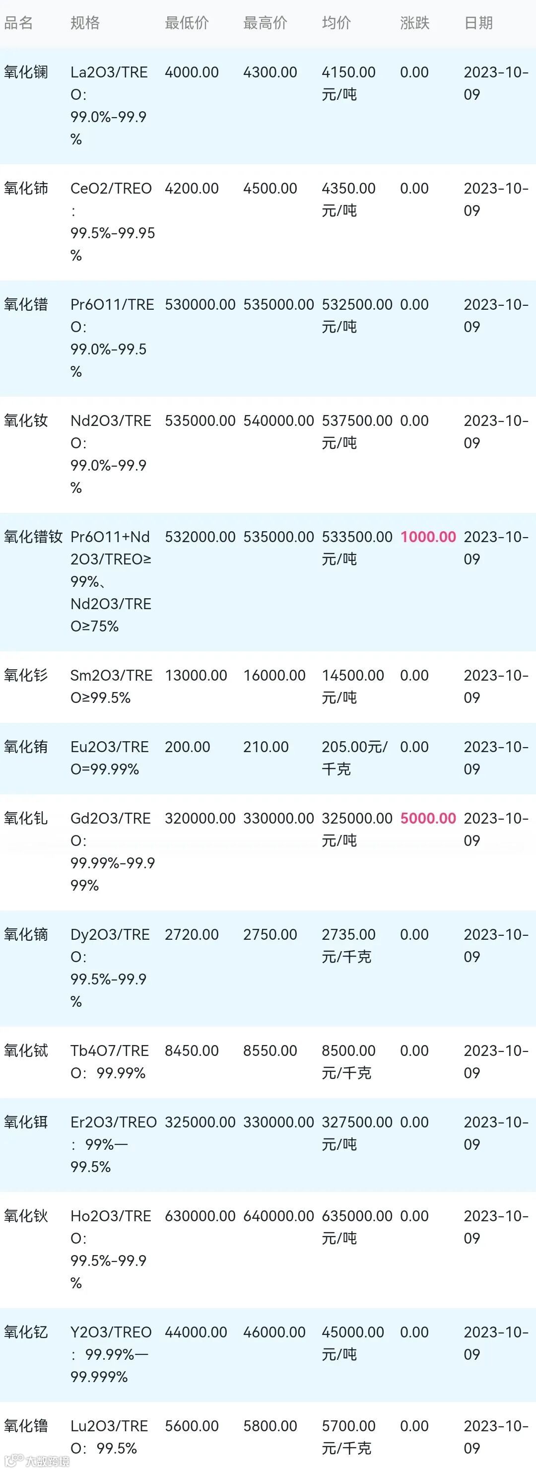 2023年10月09日稀土氧化物材料市场参考价: