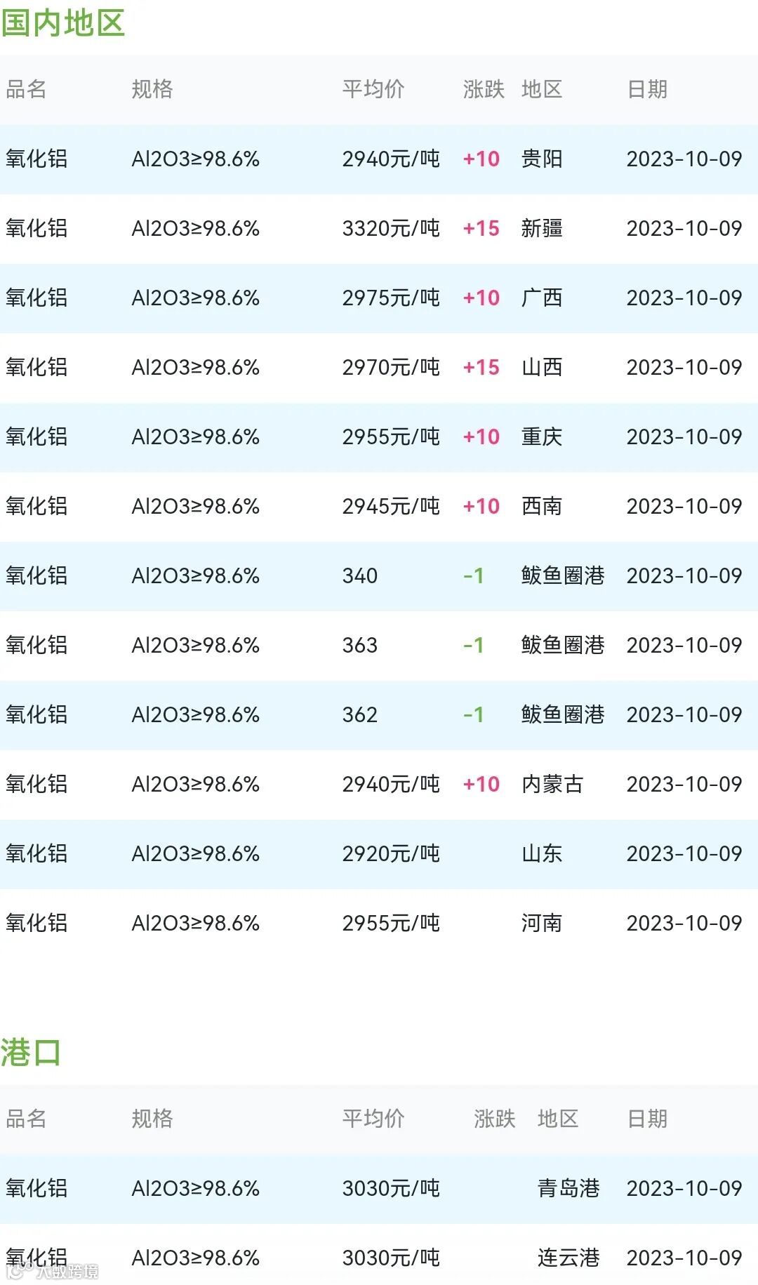2023年10月09日氧化铝粉体材料市场参考价: