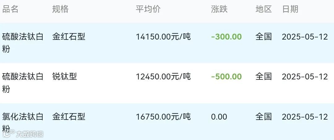 2025年05月12日钛白粉材料市场参考价: