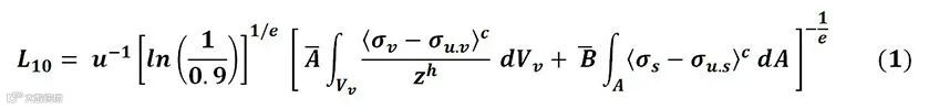 公式(1)代表通用轴承寿命模型的基础,该模型明确地将表面累积损伤与次表面疲劳分开考虑。公式(1)中由体积积分表示的次表面项,可以使用参考文献[1]中的滚动接触疲劳方法来求解。