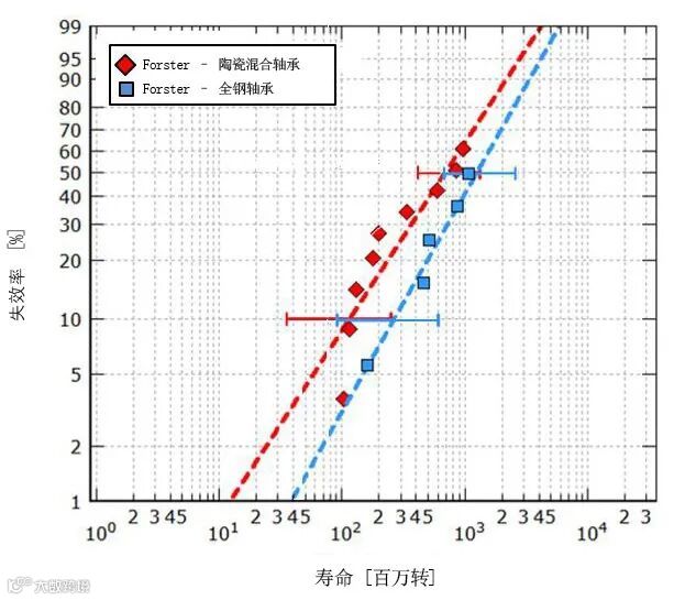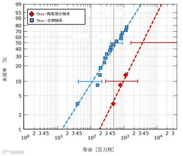 图3b 在具有挑战性的环境中,分别在最大赫兹应力2.6GPa和2.3GPa条件下测试的混合陶瓷轴承和全钢制7208型轴承的耐久寿命[9]