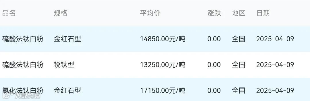 2025年04月09日钛白粉材料市场参考价: