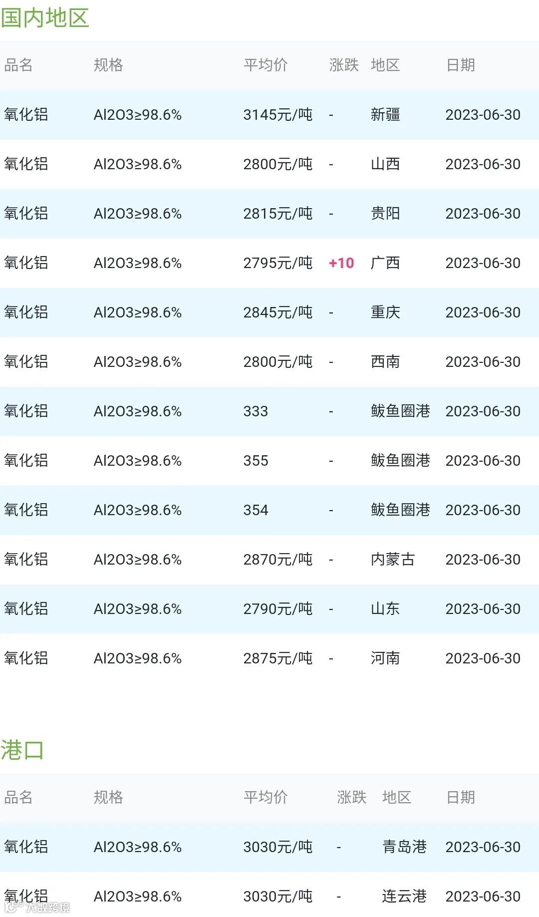 2023年06月30日氧化铝粉体材料市场参考价: