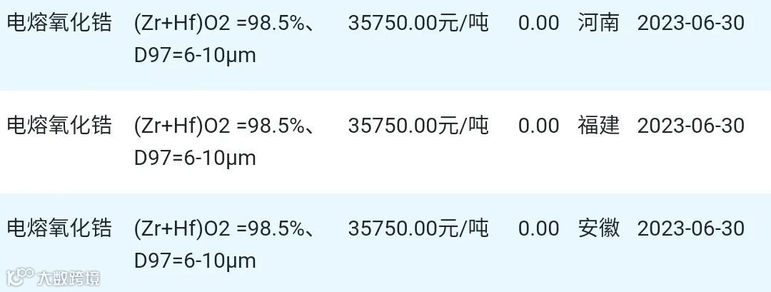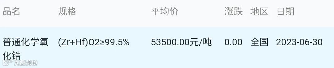 2023年06月30日氧化锆材料市场参考价: