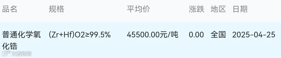 2025年04月25日氧化锆材料市场参考价: