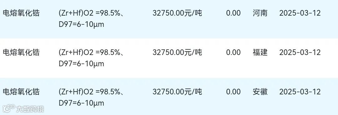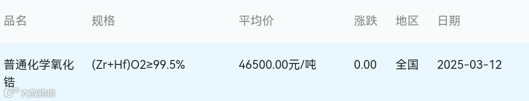 2025年03月12日氧化锆材料市场参考价:
