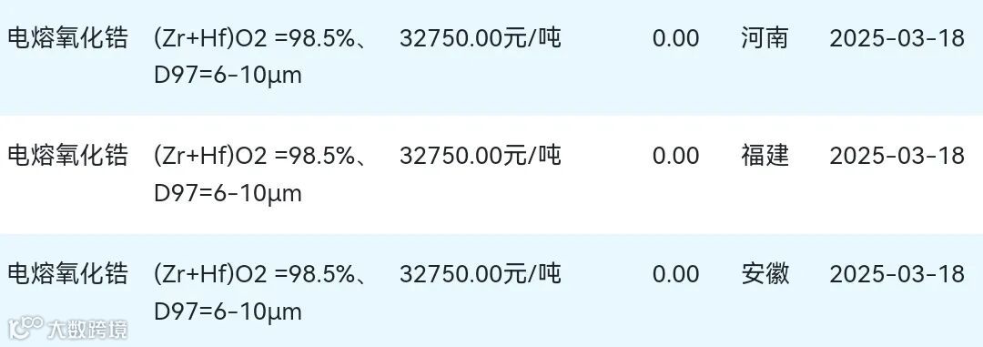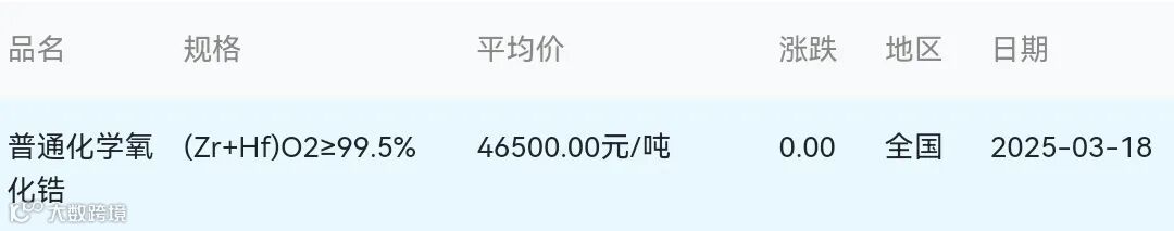 2025年03月18日氧化锆材料市场参考价: