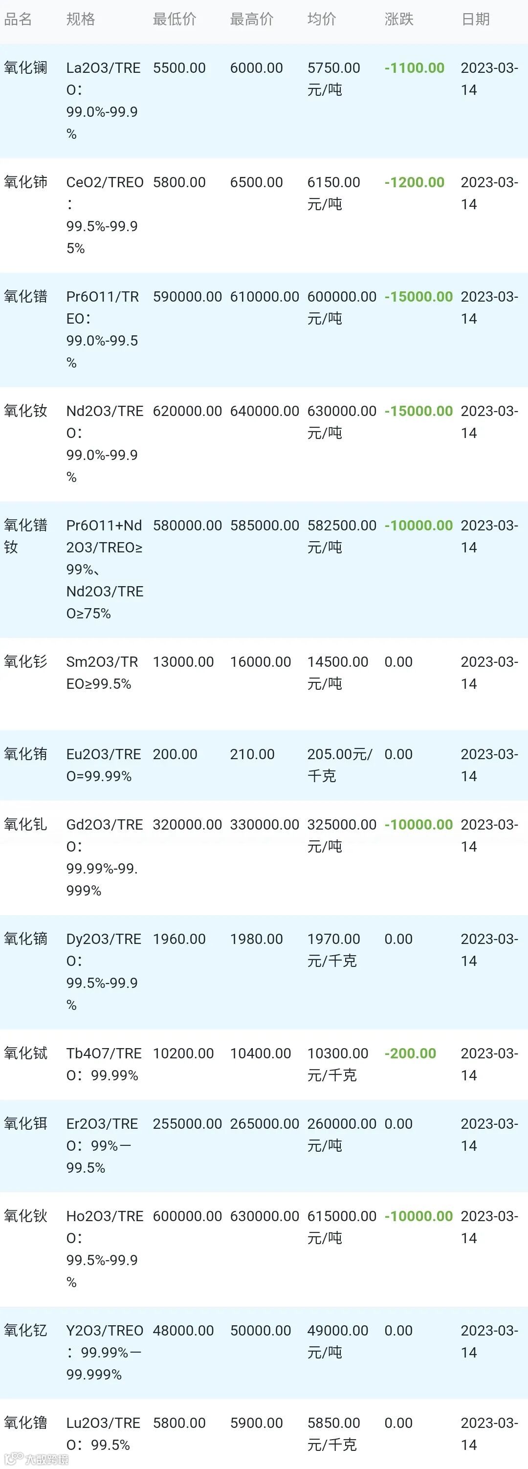 2023年03月14日稀土氧化物材料市场参考价: