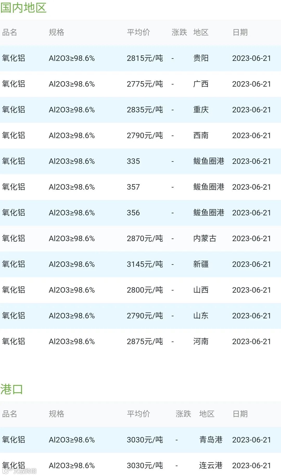 2023年06月21日氧化铝粉体材料市场参考价: