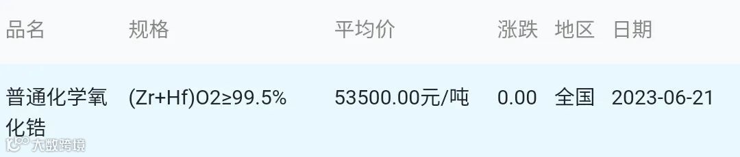 2023年06月21日氧化锆材料市场参考价: