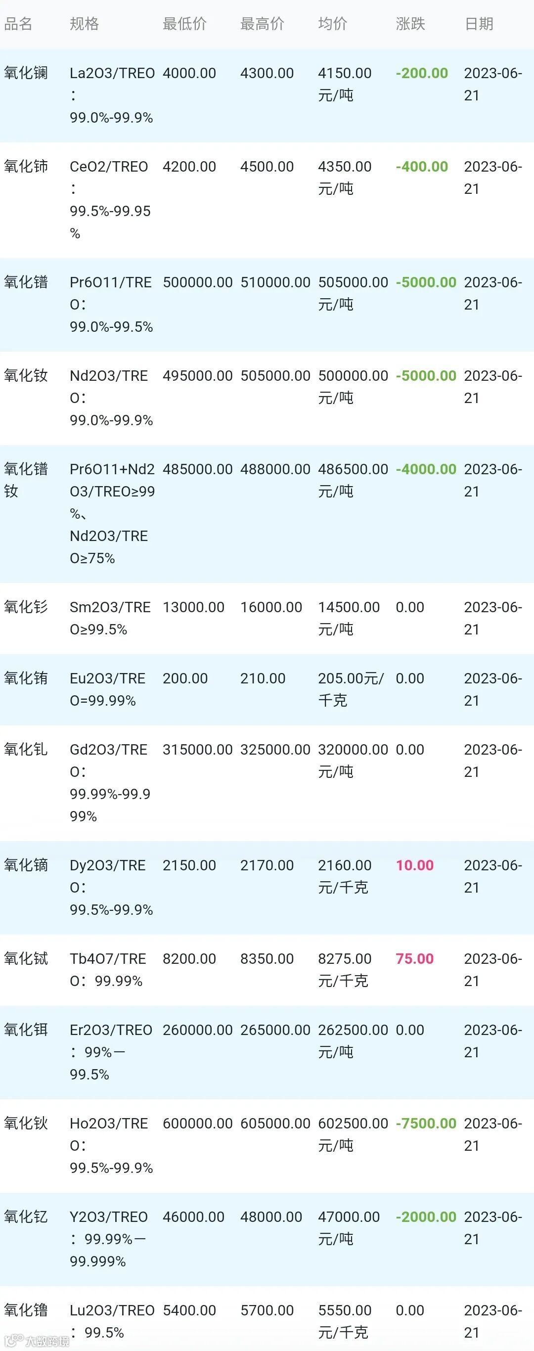 2023年06月21日稀土氧化物材料市场参考价: