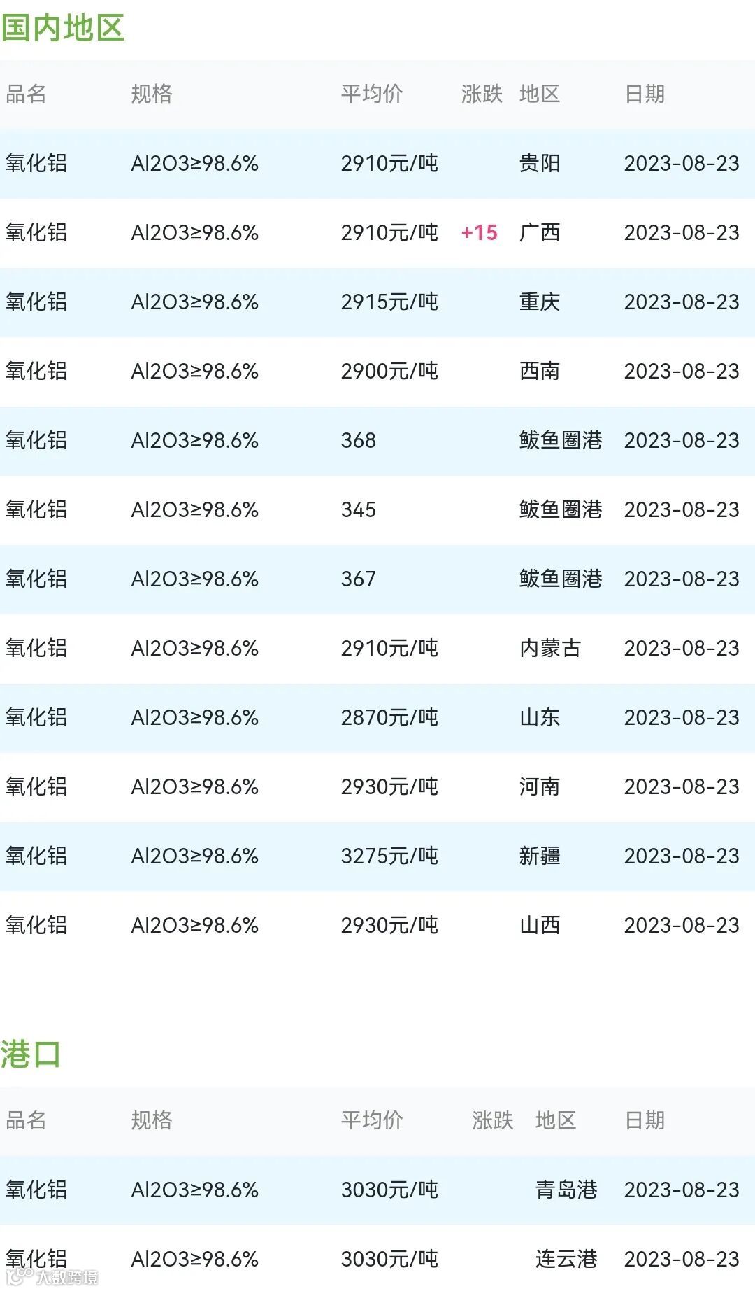 2023年08月23日氧化铝粉体材料市场参考价: