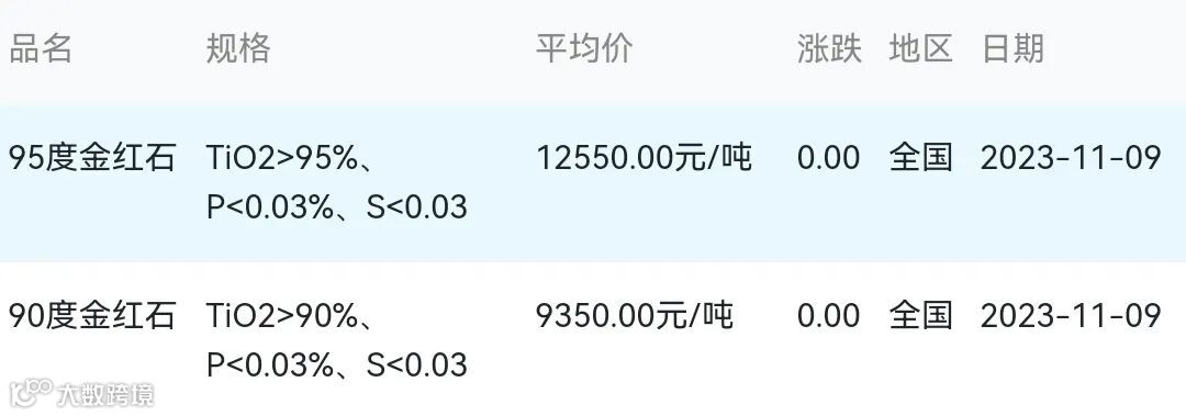 2023年11月09日金红石材料市场参考价: