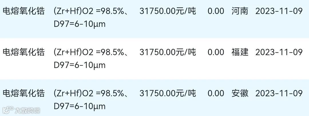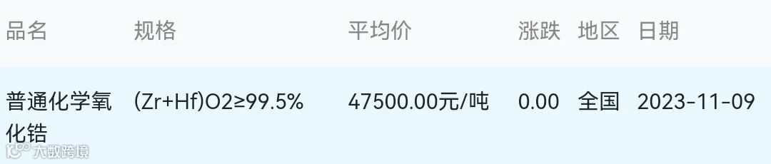 2023年11月09日氧化锆材料市场参考价: