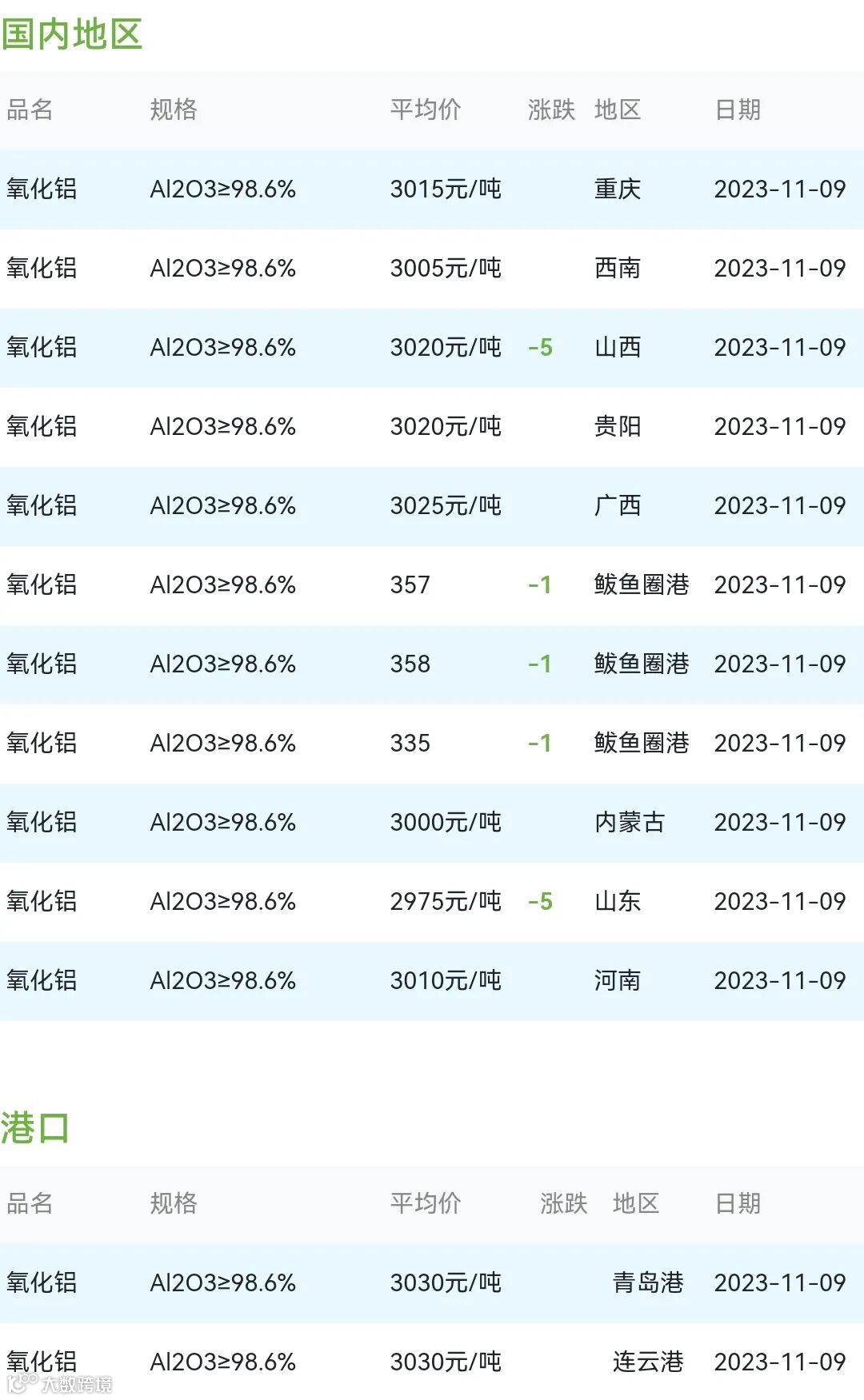 2023年11月09日氧化铝粉体材料市场参考价: