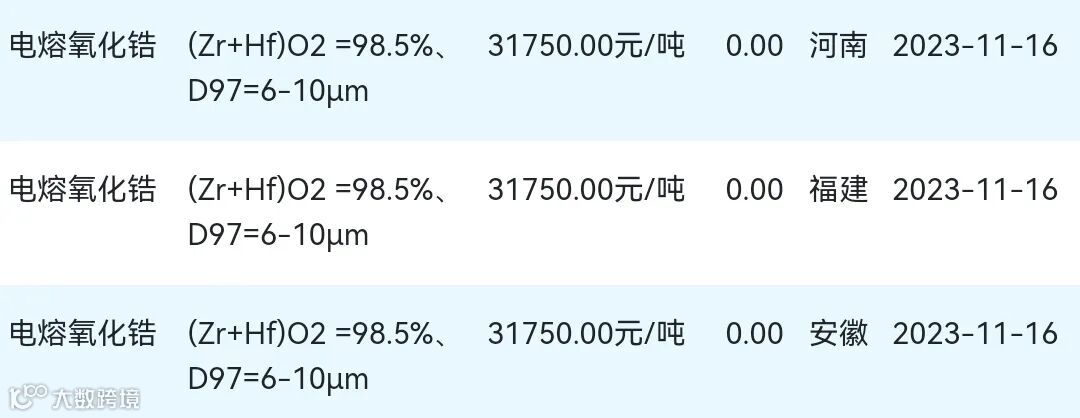 2023年11月16日氧化锆材料市场参考价: