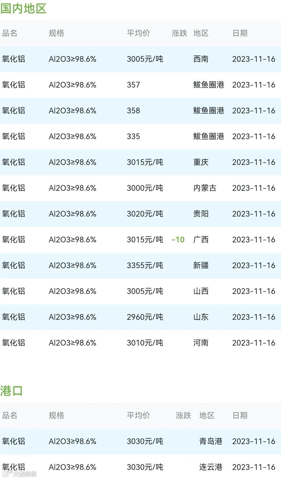 2023年11月16日氧化铝粉体材料市场参考价: