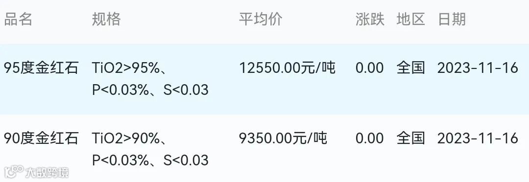 2023年11月16日金红石材料市场参考价: