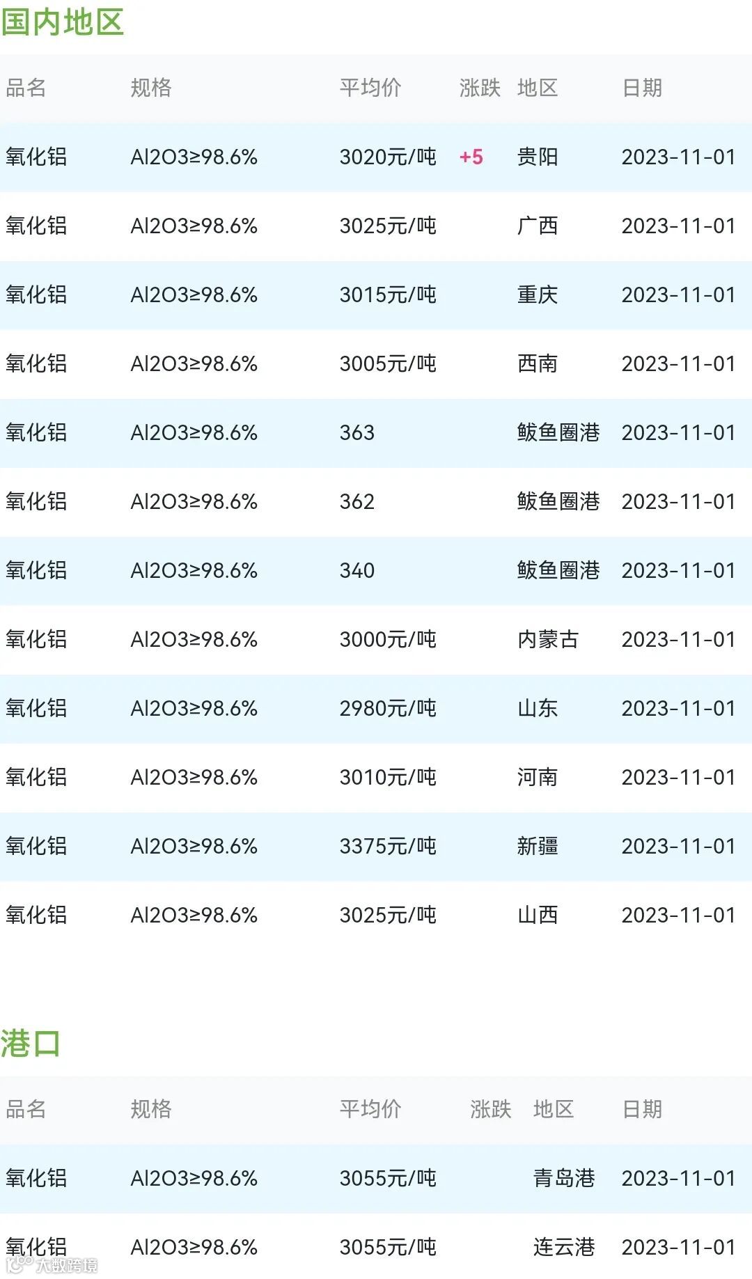 2023年11月01日氧化铝粉体材料市场参考价: