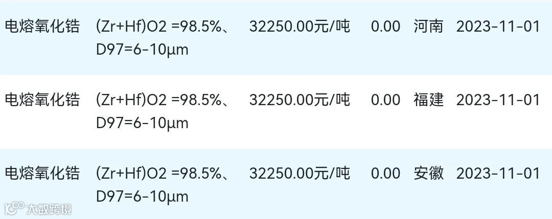 2023年11月01日氧化锆材料市场参考价: