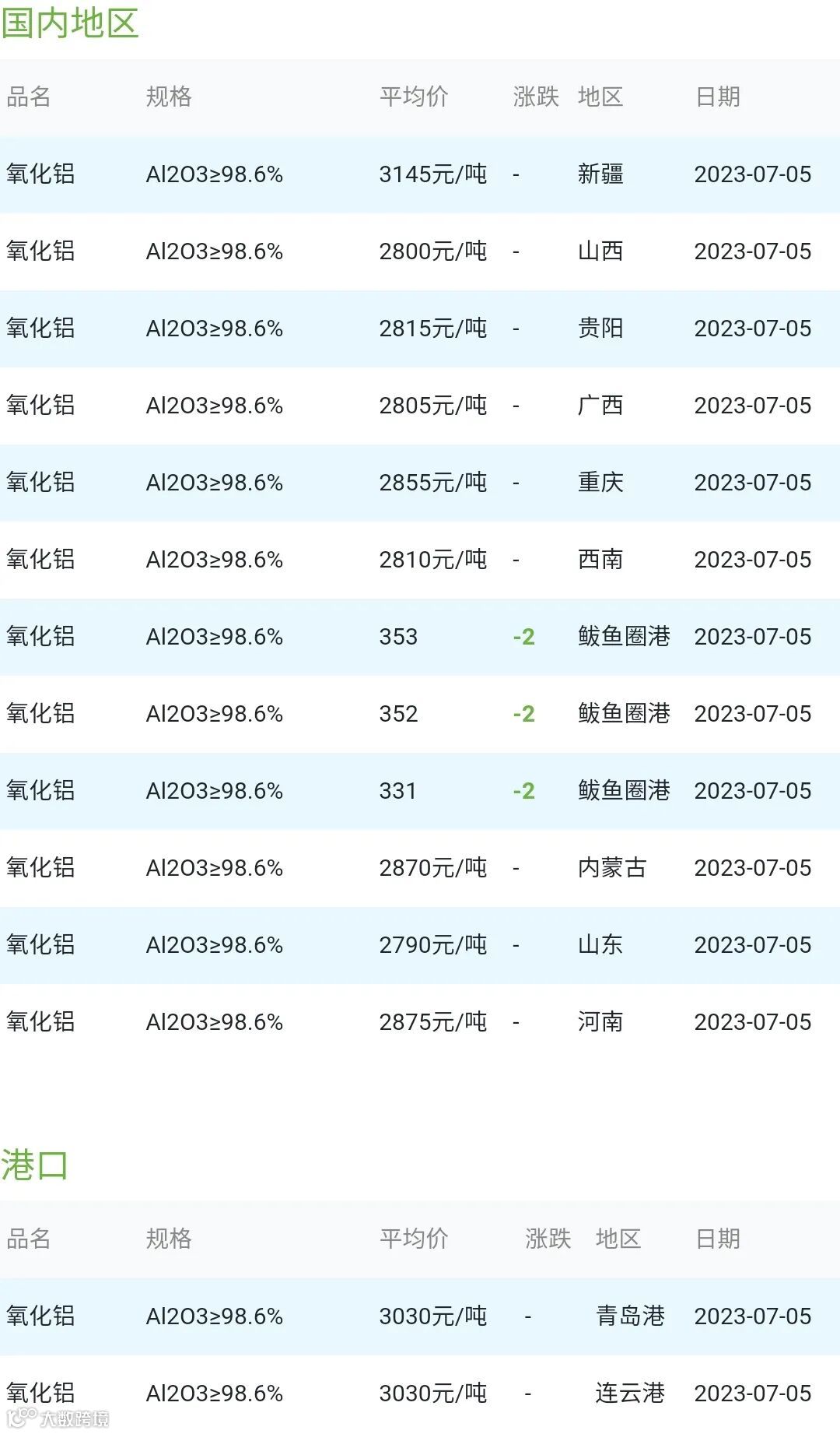 2023年07月05日氧化铝粉体材料市场参考价: