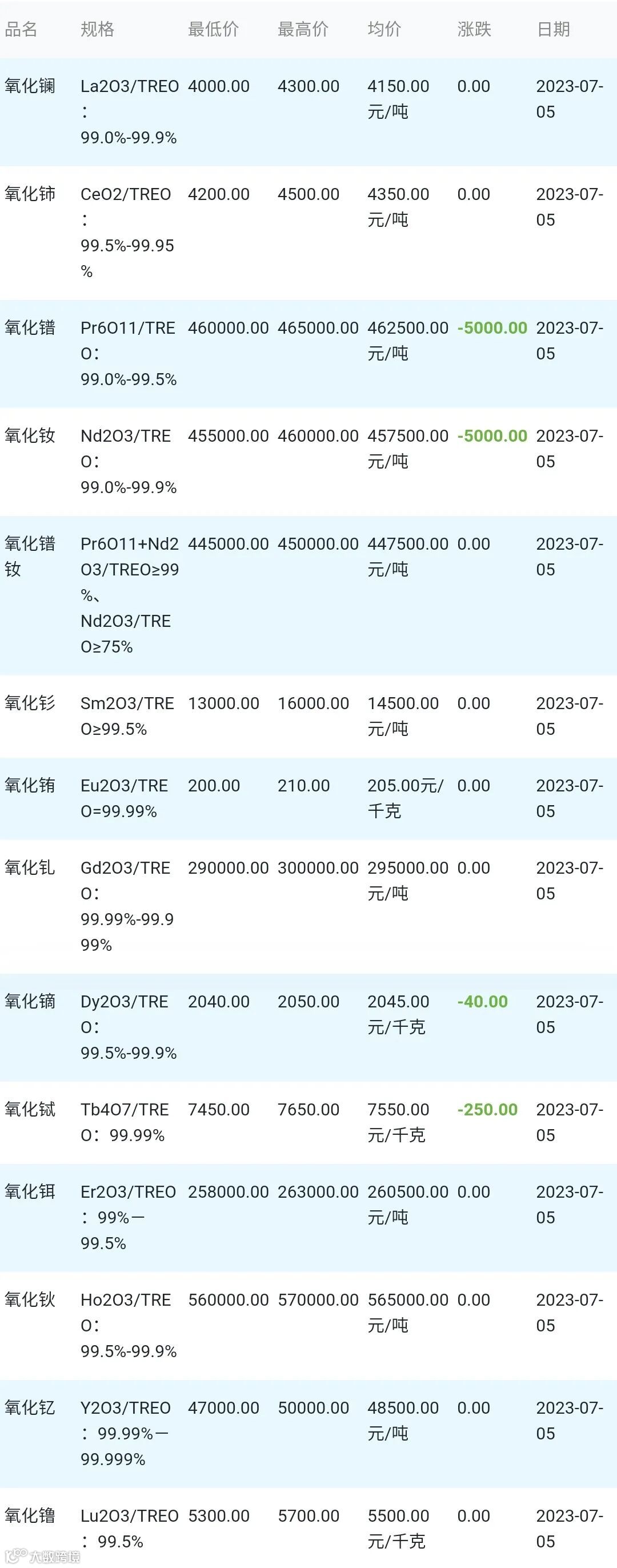 2023年07月05日稀土氧化物材料市场参考价: