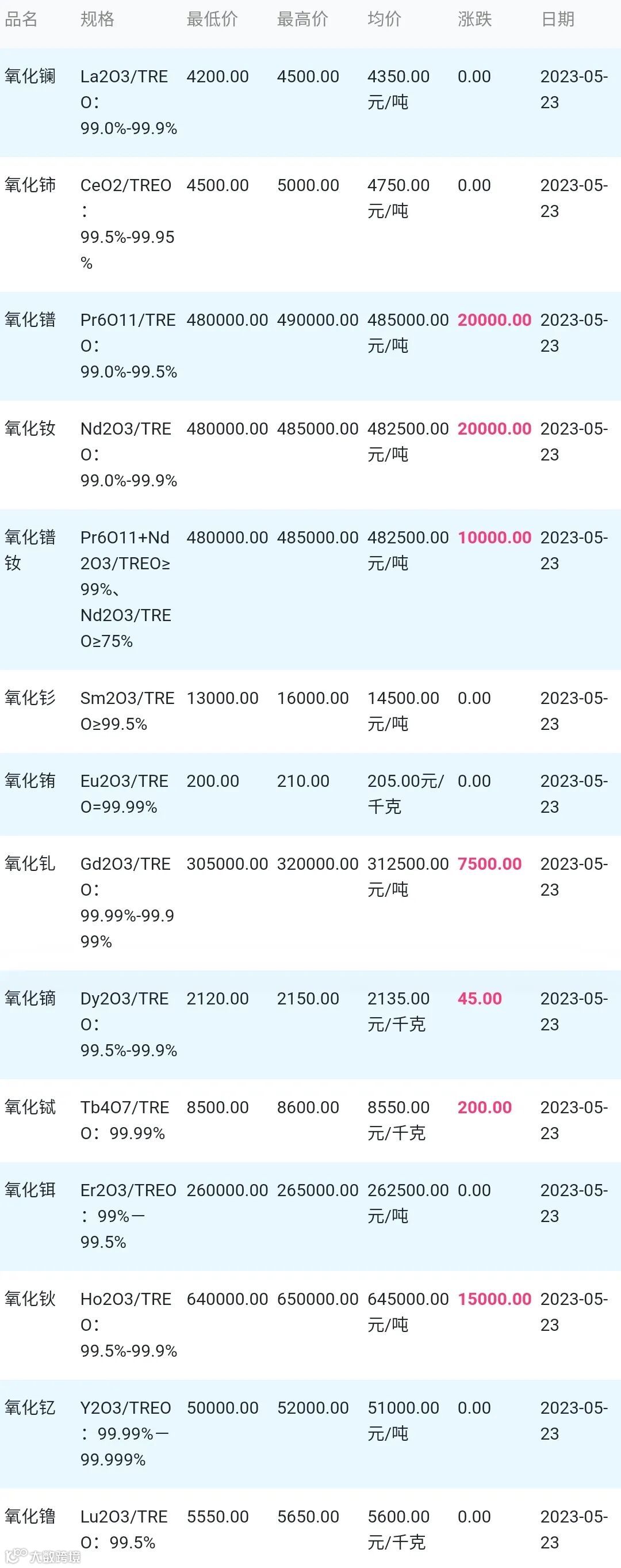 2023年05月23日稀土氧化物材料市场参考价: