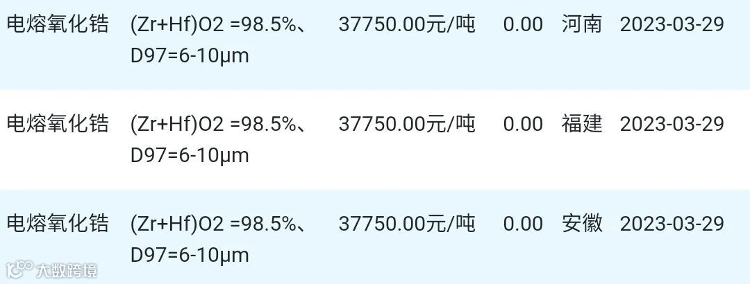 2023年03月29日氧化锆材料市场参考价: