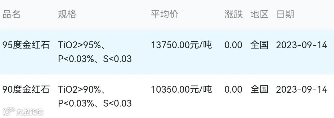 2023年09月14日金红石材料市场参考价: