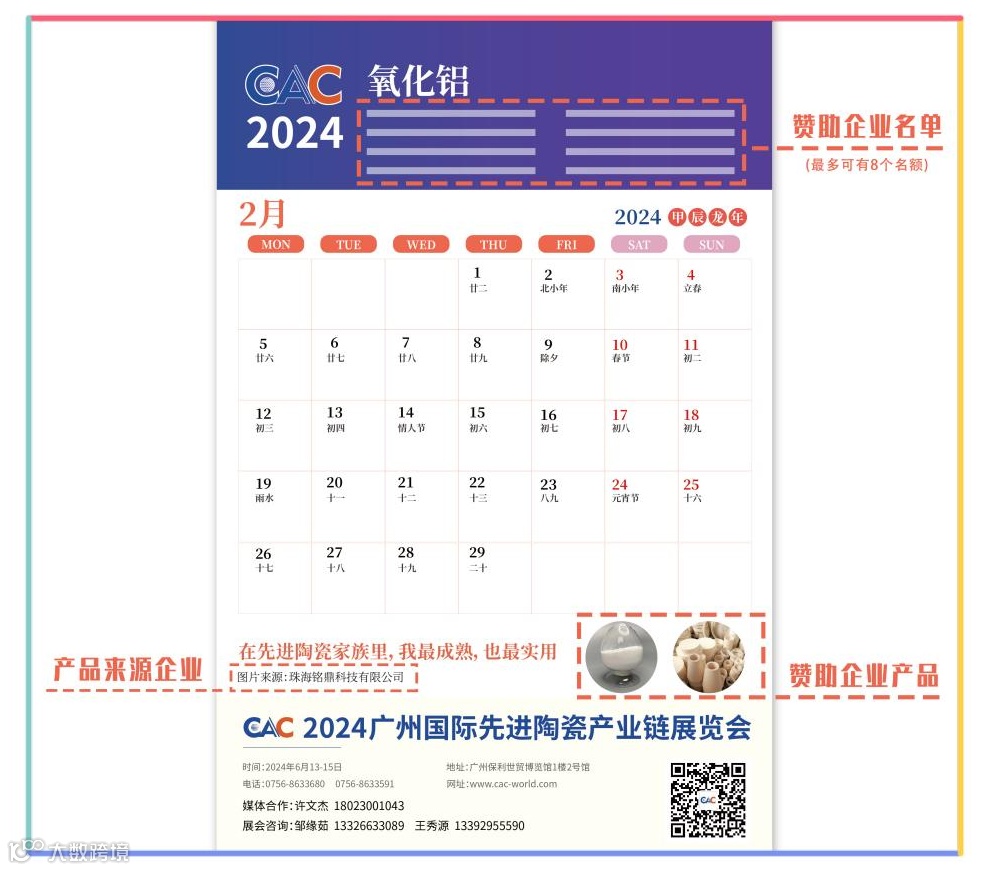 2024年,我们将在广州保利世贸博览馆迎来第3届广州国际先进陶瓷展,开拓华南先进陶瓷应用市场的桥头堡正在悄悄搭建。为了提升展会的影响力,宣传展商的产品,我们策划了CAC2024年台历项目,诚邀您的参与,优先向精准目标客户投放您的企业和产品信息,把您优秀先进陶瓷产品搬到客户办公台面上展示。