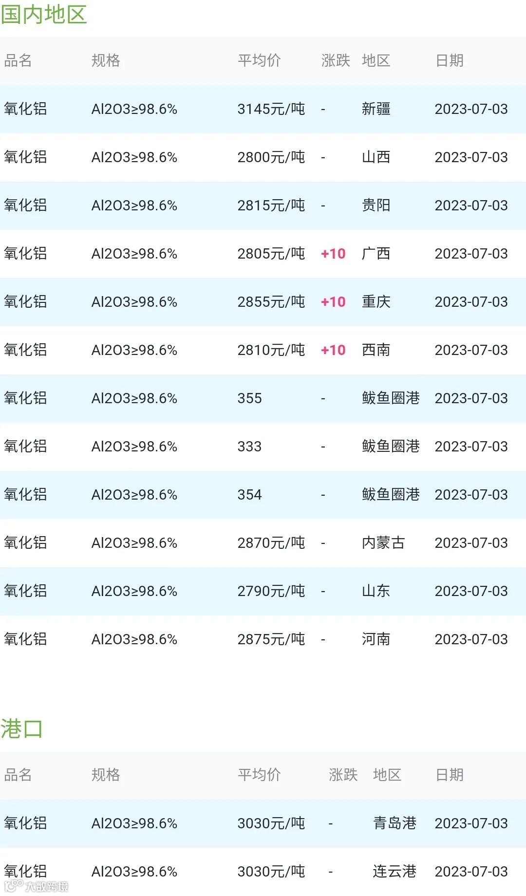 CERADIR先进陶瓷在线2023年07月03日氧化铝粉体材料市场参考价: