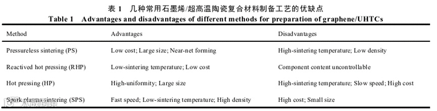 选择合适的制备工艺是获得理想复合材料结构与性能的关键。目前,石墨烯/超高温陶瓷基复合材料主要是通过粉末烧结致密化工艺制得,即先制备出石墨烯/超高温陶瓷复合粉体,再进行烧结致密化得到具有一定致密度的块体复合材料。此法工艺简单、材料性能好、参数易调控,目前大部分的石墨烯/超高温陶瓷复合材料均采用这类工艺进行制备。