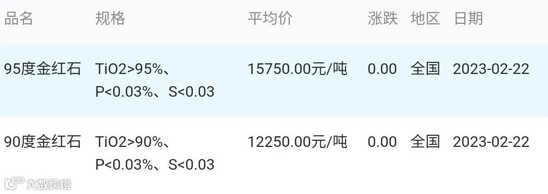 2023年02月22日金红石材料市场参考价: