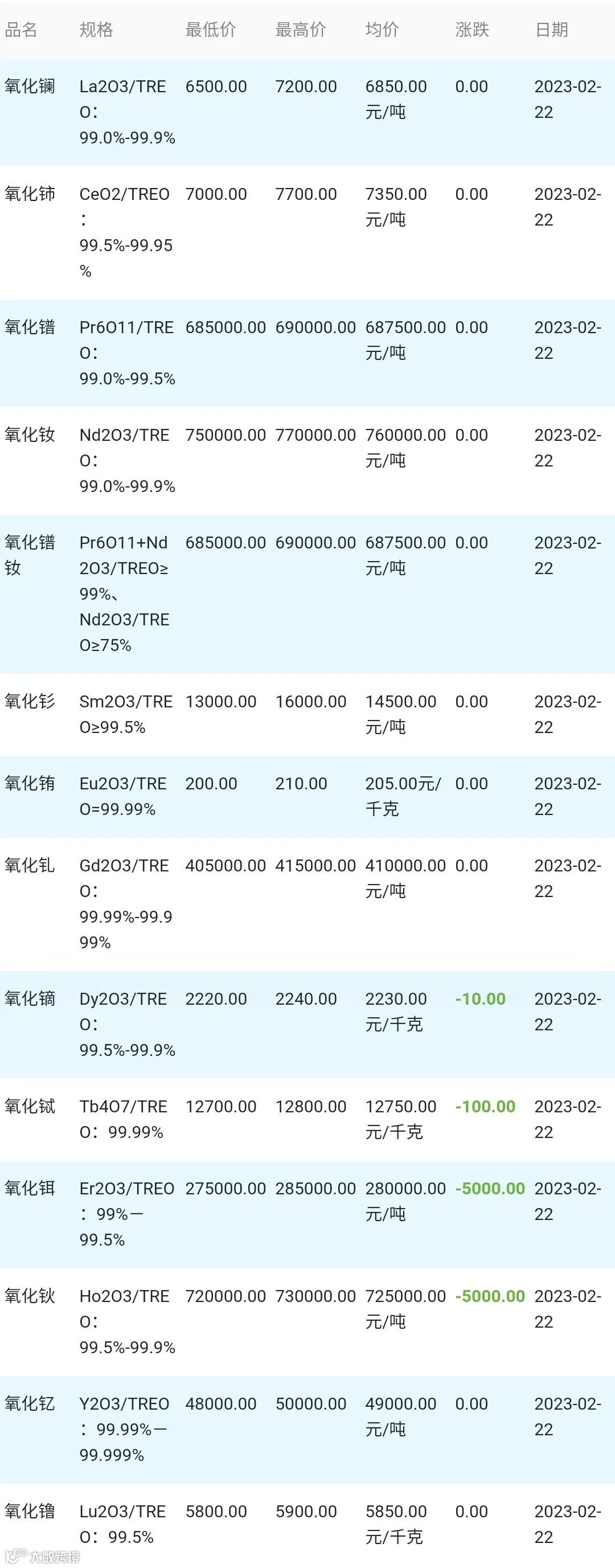 2023年02月22日稀土氧化物材料市场参考价: