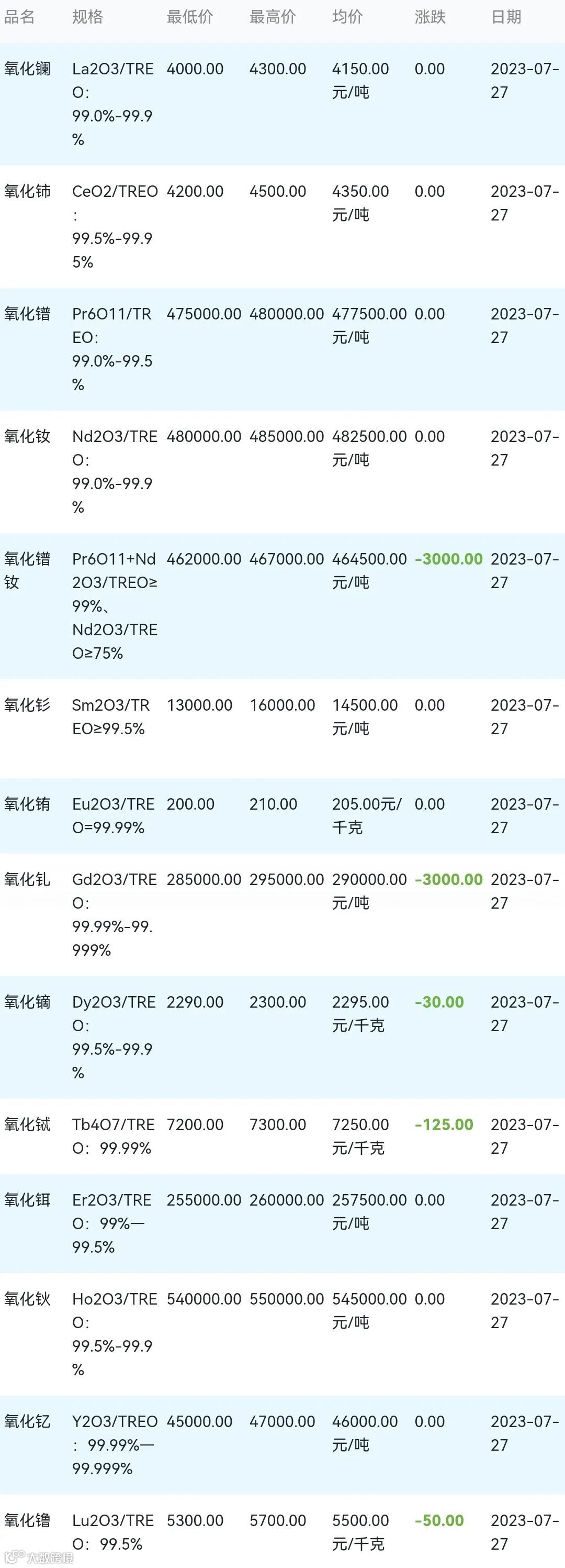 2023年07月27日稀土氧化物材料市场参考价: