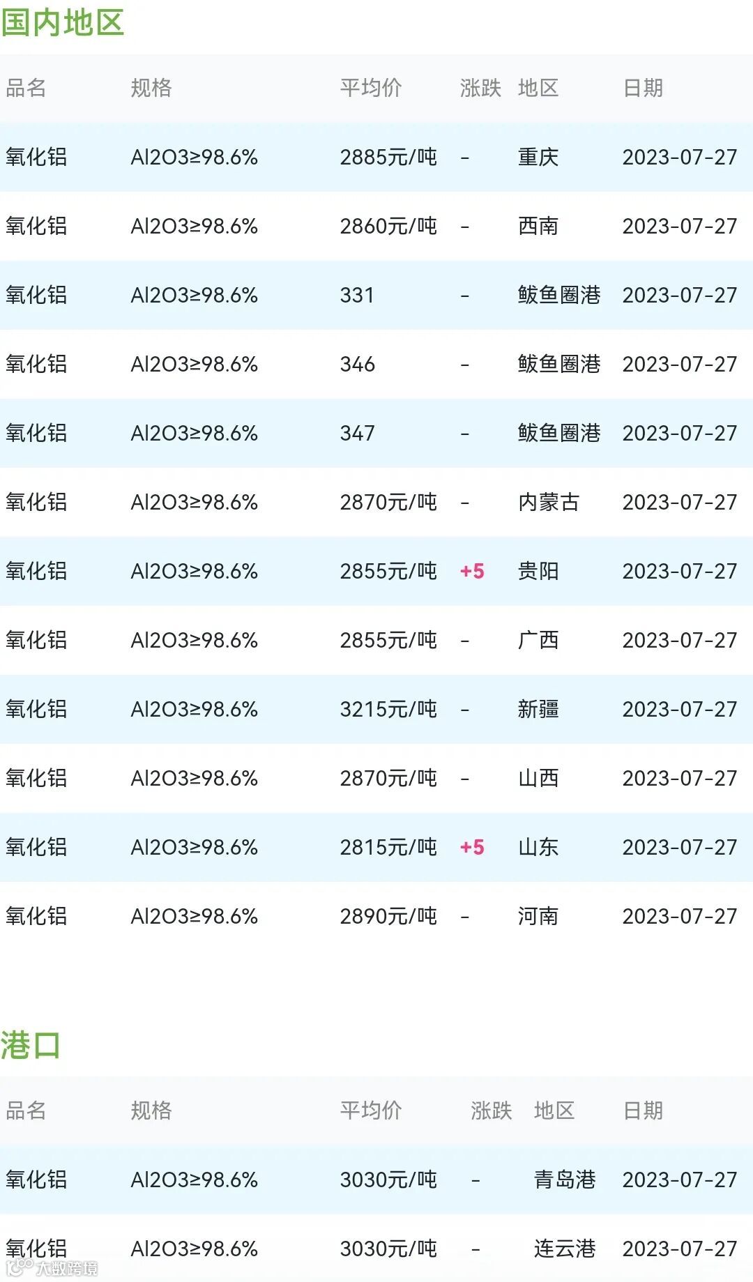 2023年07月27日氧化铝粉体材料市场参考价: