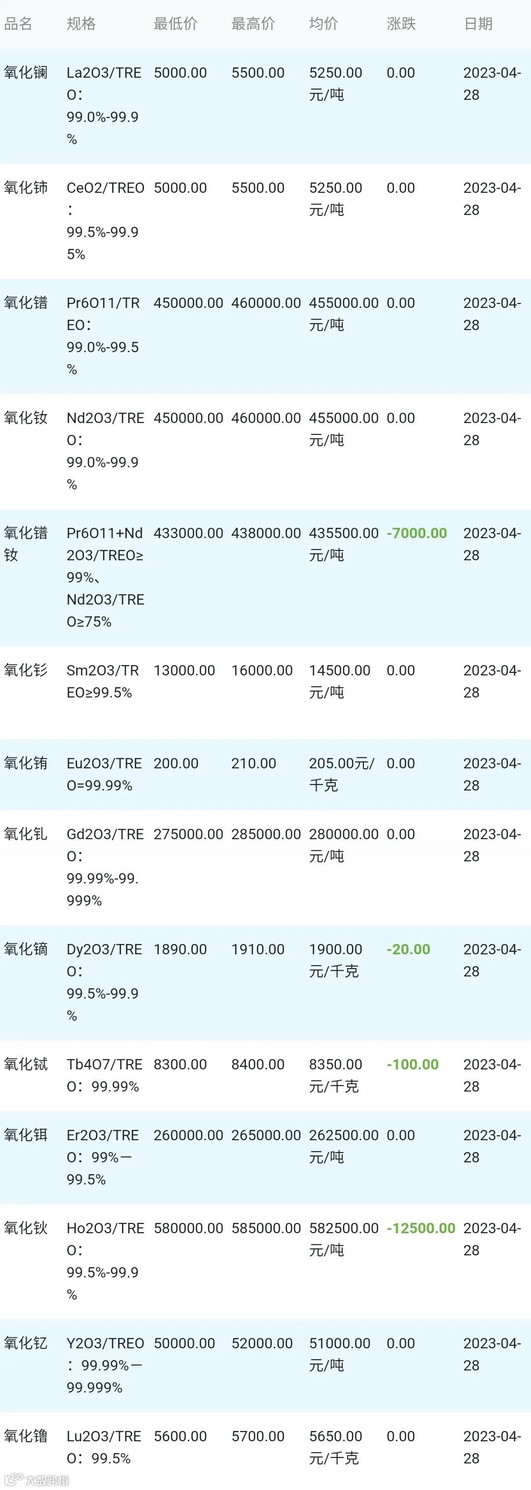 2023年04月28日稀土氧化物材料市场参考价: