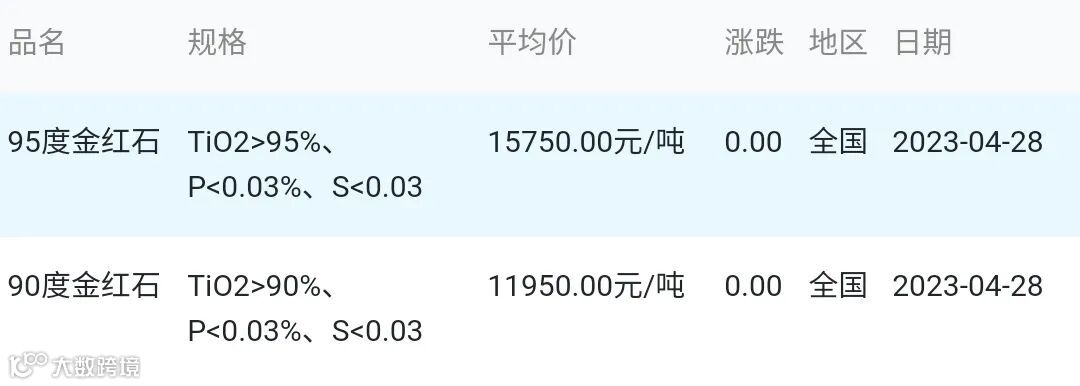 2023年04月28日金红石材料市场参考价:
