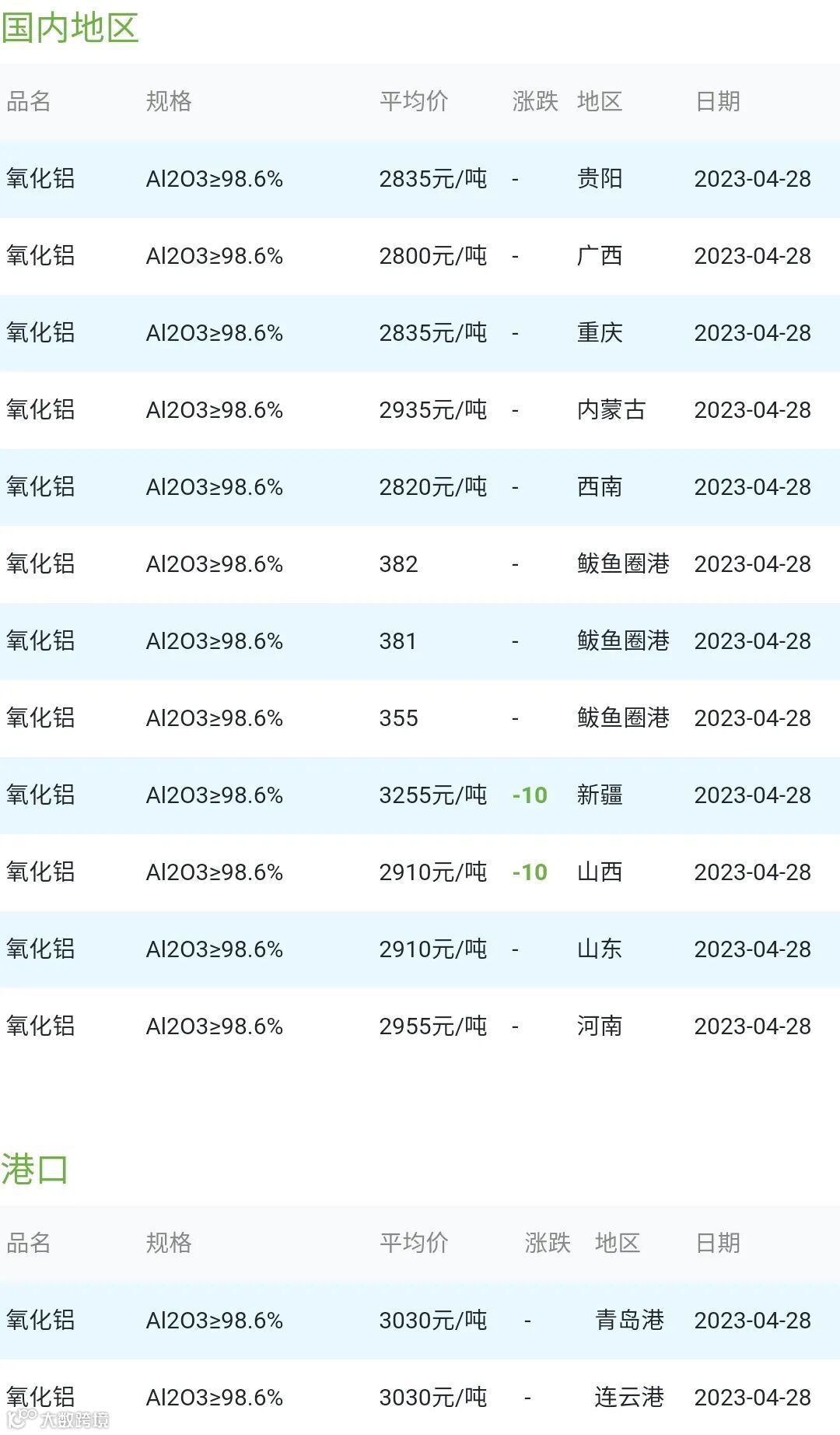 2023年04月28日氧化铝粉体材料市场参考价:
